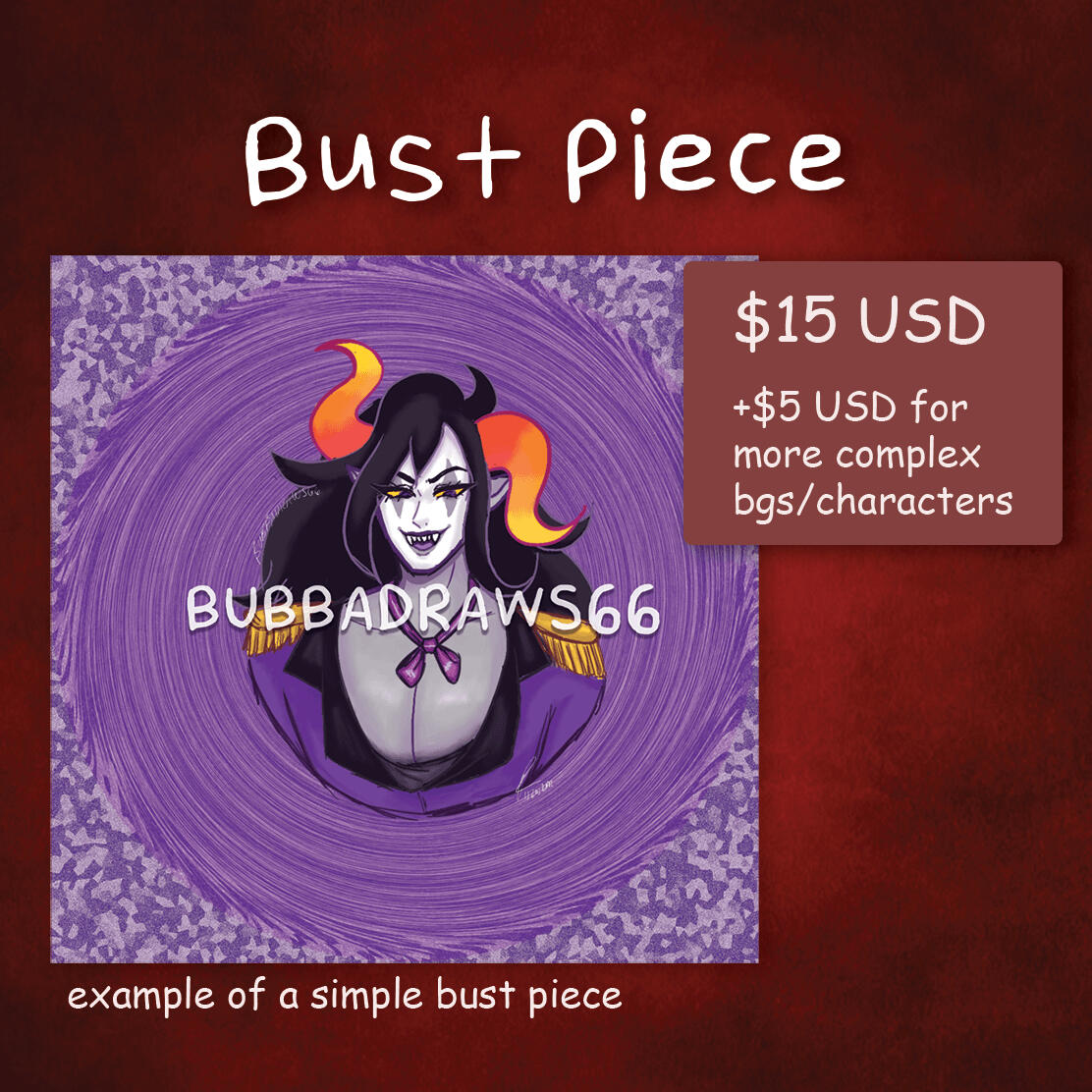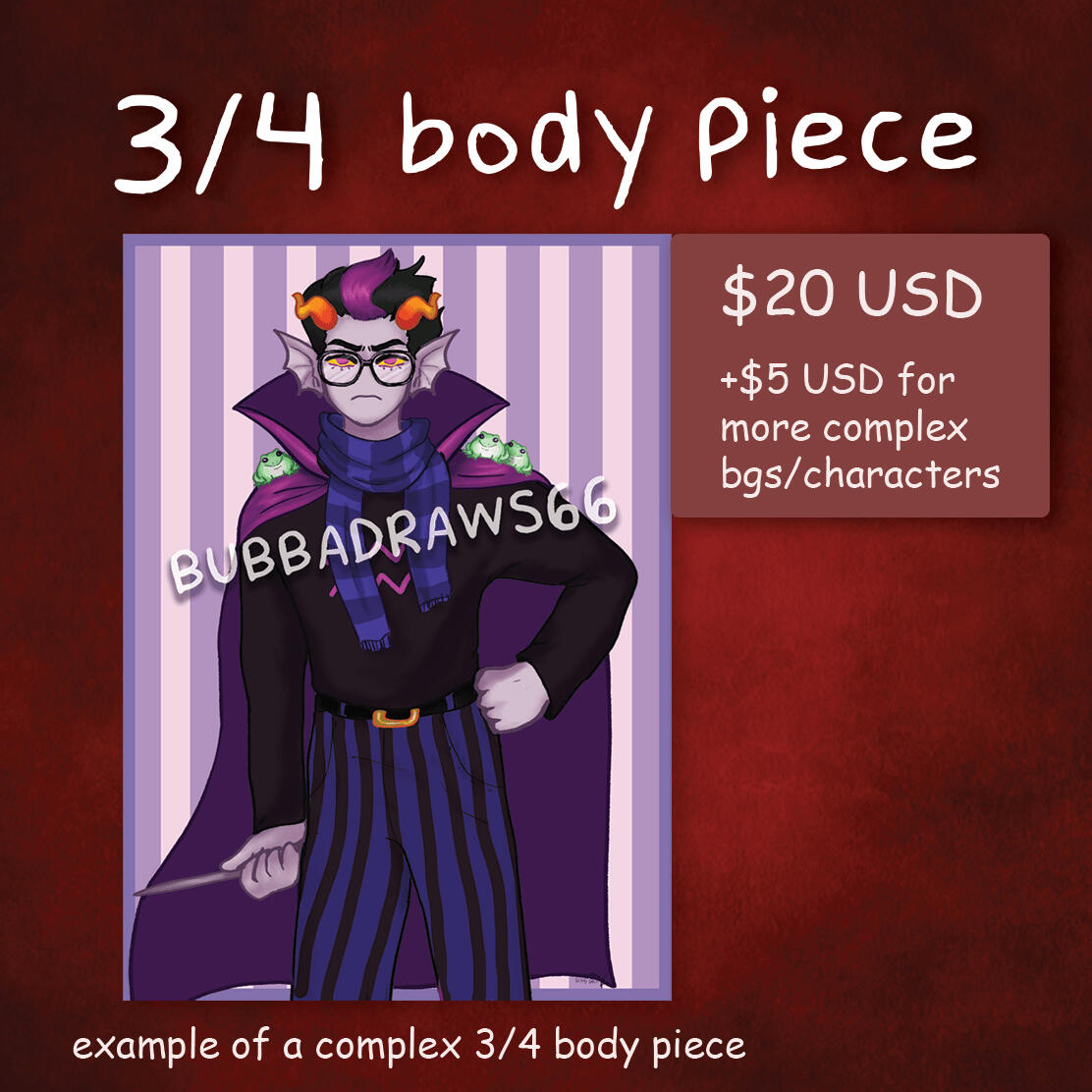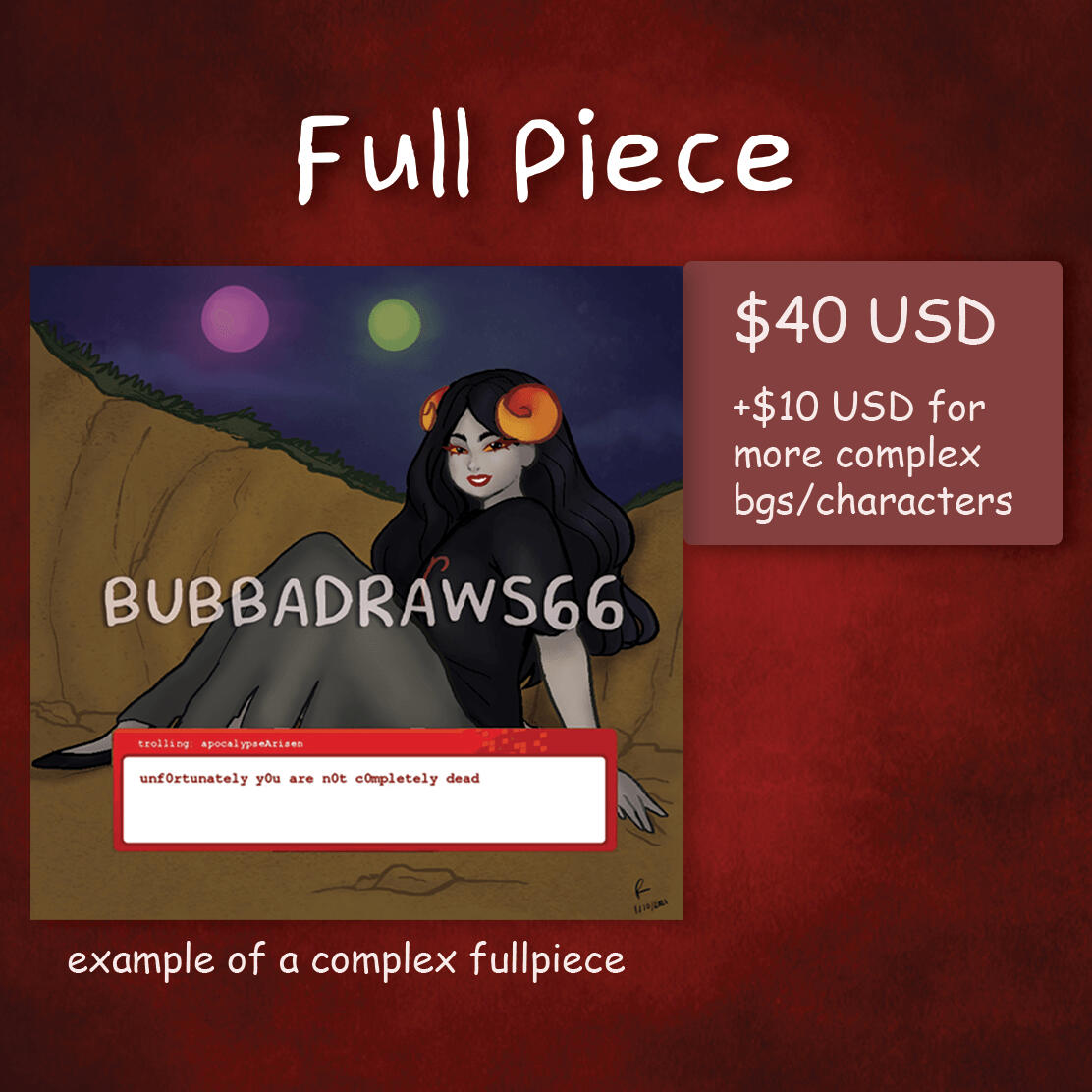 I ONLY accept it through paypal.I price my work based on complexity, time, and labor spent on it.If you claim a commission piece I did as your own artwork, I will not accept any commissions from you in the future.I plan on posting watermarked versions of my commissions once they're finished, but if you don't want me to post it, I'll ask you permission beforehand.If you use commissioned work and/or work from me for commercial purposes(nfts, etc.), you are violating my terms of service. You will be blocked, and possibly face legal council.If you want to post my work on your own account, make sure you credit me in the post by tagging me in it.I am a full time student, so it will take me a while to finish them, I appreciate your patience.